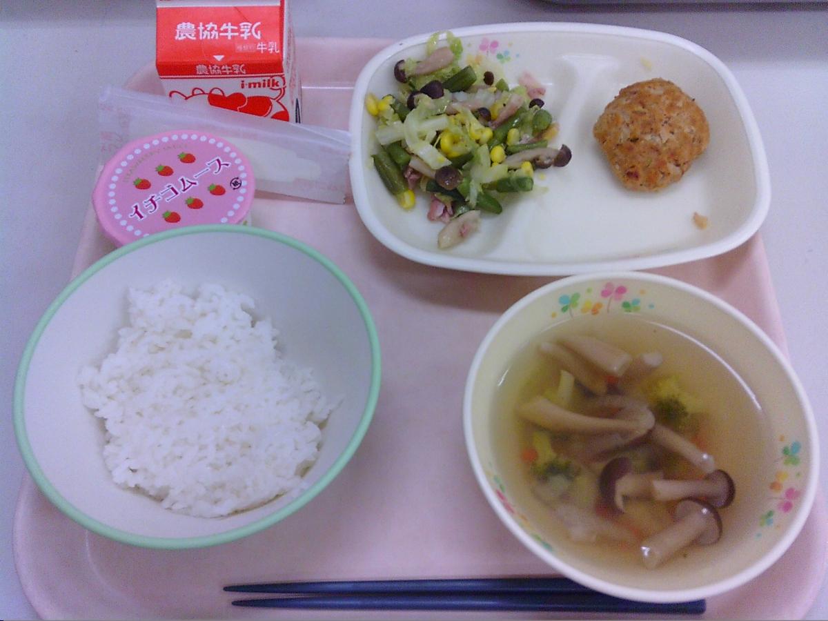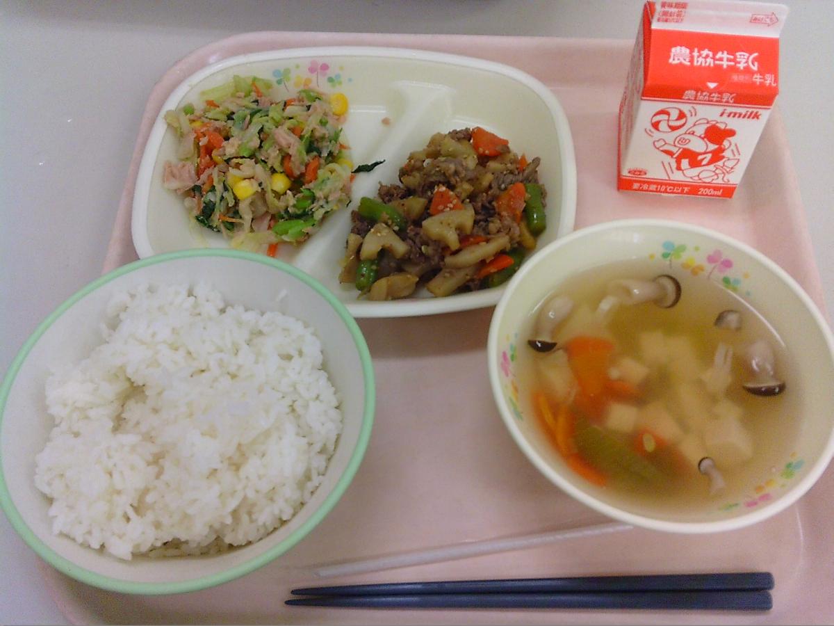 今日のメニューは、ご飯・牛肉とれんこんのピリ辛いため・小松菜とツナの和え物・豆腐のすまし汁・牛乳でした。今日のお昼にミニコンサートを開いて下さる上條みずほさんご家族と堀部潔さんと一緒にいただきました。「久しぶりの給食!」と喜んでいただき、和気あいあいとお話しながらいただくことができました。今日も美味しい給食をありがとうございました!