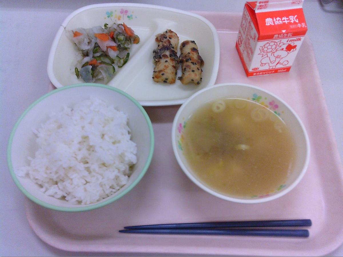 今日のメニューは、ご飯・ちくわの石垣揚げ・やたら漬け・なめこと大根のみそ汁・牛乳でした。先日来校された上條様からいただいたドーナツもつけました。今日もみんなで会話しながら、食事の時間を楽しんで食べていました。今日も美味しい給食をありがとうございました!