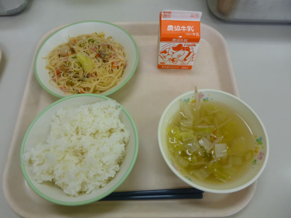 今日のメニューは、ご飯・豚肉とビーフンのぴりから炒め・白菜の中華ソープ・牛乳でした。25日に来校され、ツリークライミングを行っていただいたチーム八ヶ岳様からいただいたもデザートにつけました。子どもたちには、子どもたちには豚肉とビーフンのぴりから炒めの味が好評で、おいしそうに頬張っていました。ごちそう様でした!