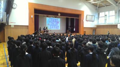 外日角小学校を卒業した2名の中学校1年生が来校し、中学校に向けて6年生が不安に感じていることを説明してくれました。