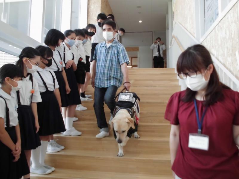 10月6日、総合的な学習で視覚障害者の西さん・盲導犬ウーノくんを招いて、お話を聞きました。