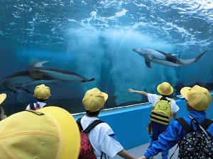 大きなジンベエザメ、イルカショーなど 子ども達は目を輝かせ見ていました。