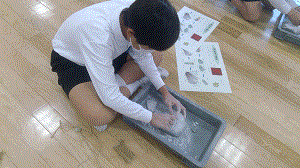 6月17日、かほく市スポーツ文化課よりゲストティーチャーを招き、歴史体験教室を開催しました。ガイダンスでは、縄文時代や弥生時代の生活の様子や遺跡から見つかったものなどについて、授業で学んだことよりさらに具体的に教えていただきました。実際に見つかった土器や黒曜石を近くで見たり触ったりすることもできました。体験では弥生土器づくりを行いました。粘土を葉の上に乗せ、当時の様子を想像しながらそれぞれ個性が見られる土器を形成することができました。10月には今回作った土器を焼くので、それまでは学校で乾燥させておきます。丈夫な土器に仕上がるといいですね。