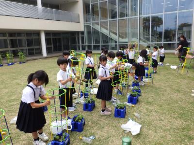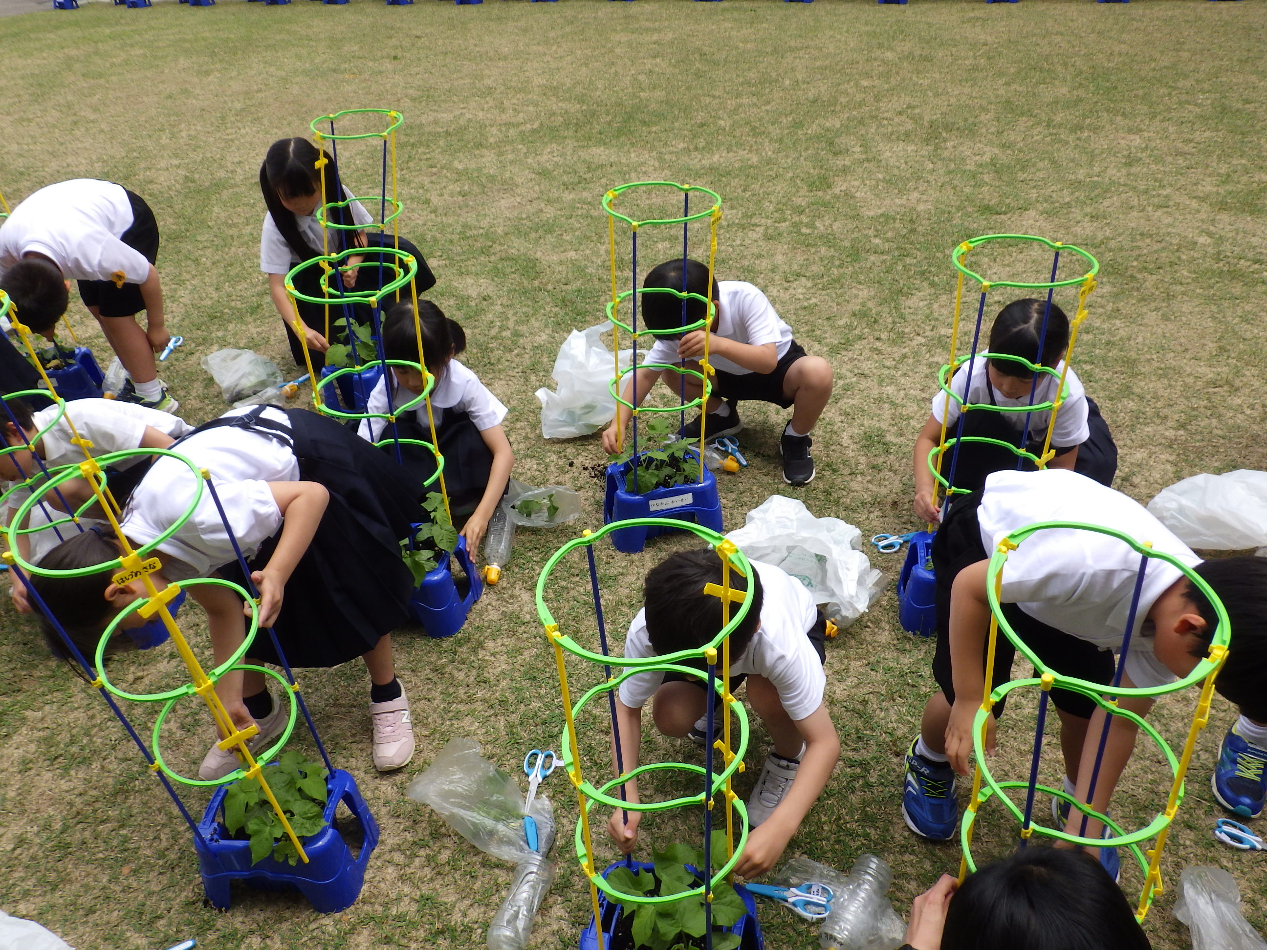 1年生の朝顔のつるがだんだん伸びてきたので、支柱を立てました。
