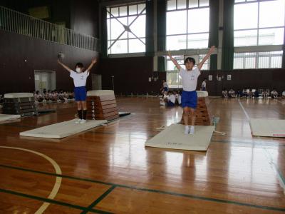 金津小学校、高松小学校の児童と交流し、跳び箱、マット、鉄棒の3つの種目を披露しました。