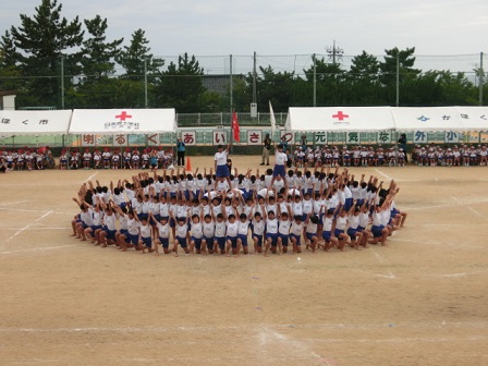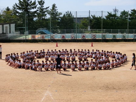 今日、5限目に応援練習が行われました。自分の場所から応援の場所へ。そして、6年生の誘導のもと人文字の場所へ。それぞれの組が、何という字を表しているか分かりますか?