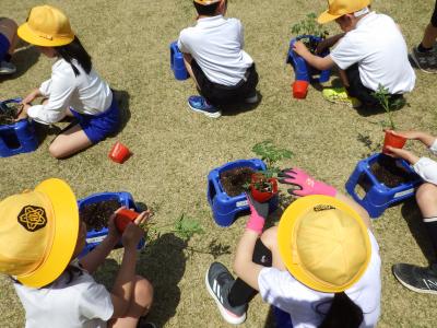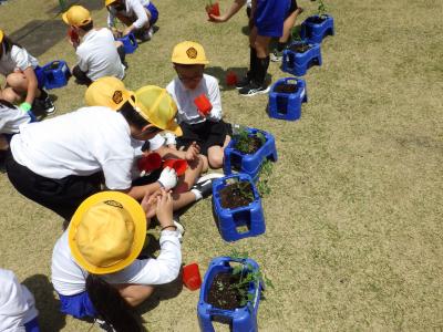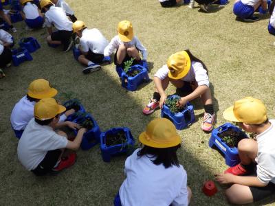 2年生が生活科の学習でミニトマトの苗を植えました。
