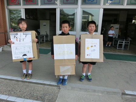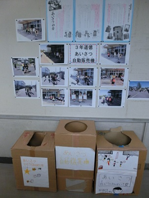 3年生の道徳の副読本に「あいさつ自動はんばいき」という素敵な資料が載っています。それについてみんなで考えた3年生。段ボールで自動販売機を作ったようです。毎朝、高学年からリレーされていた朝の挨拶運動。2年生は、3年生の段ボール製「あいさつ自動販売機」を借りて、その思いを引き継ぎ、挨拶運動をとても元気に頑張ってくれました。