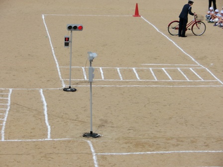 今回の自転車教室に合わせて、河北ロータリークラブの皆さんが、信号機を寄付して下さいました。これまでと違いケーブルのない、そして歩行者用の信号も付いた立派なものです。子どもたちの交通安全のためにご配慮頂き、感謝申し上げます。今日は、信号機を使っての子どもたちの練習風景を見においでました。