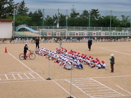 お天気が心配された今日でしたが、無事に自転車教室を行うことができました。グラウンドは少しお湿りをもらい、白線がちょうど良く地面になじみ、時折お日様の日差しのある中、警察の方々に正しく安全な自転車の乗り方を教えてもらいました。おうちで乗るときも、今日習ったことを守って、安全に気を付けて乗って下さい。