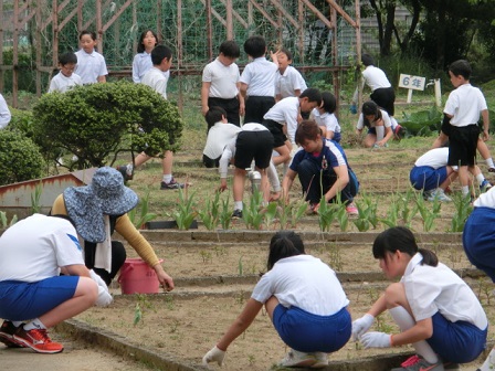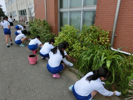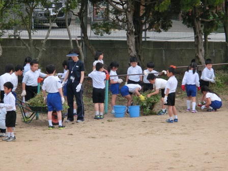 今日の午後、全校除草が行われました。運動場や中庭を学年毎に分担を決めて取組みました。高学年はどの場所にも草を集めにまわってくれました。みんなのおかげで、とてもすっきり、きれいになりました。保護者の皆様、軍手を持たせて頂き、ありがとうございました。