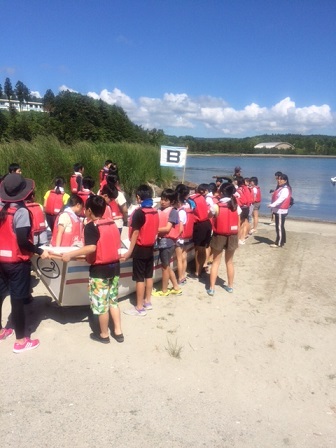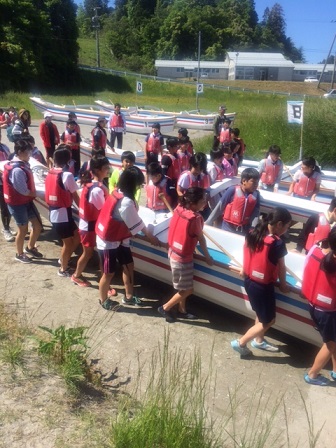 さあ、いよいよ合宿のメイン活動、大型カヌー体験です。この活動こそ、「協力」を実感する活動です。お天気はよかったものの、昨日の午後はカヌー体験が中止になっていましたから、今日は風の強さもちょうどよく、体験できでよかったです。青い空と青い海のもとでの活動でした!
