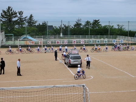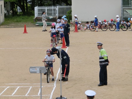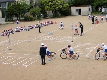 お天気が心配された今日でしたが、無事に自転車教室を行うことができました。グラウンドは少しお湿りをもらい、白線がちょうど良く地面になじみ、時折お日様の日差しのある中、警察の方々に正しく安全な自転車の乗り方を教えてもらいました。おうちで乗るときも、今日習ったことを守って、安全に気を付けて乗って下さい。
