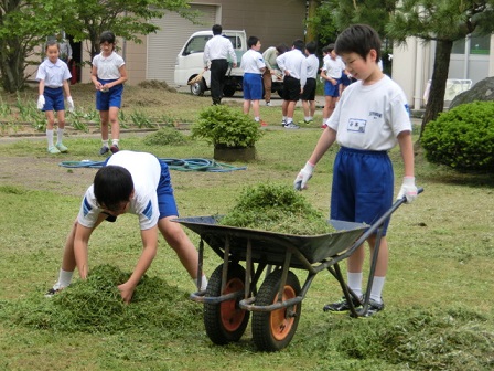今日の午後、全校除草が行われました。運動場や中庭を学年毎に分担を決めて取組みました。高学年はどの場所にも草を集めにまわってくれました。みんなのおかげで、とてもすっきり、きれいになりました。保護者の皆様、軍手を持たせて頂き、ありがとうございました。