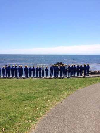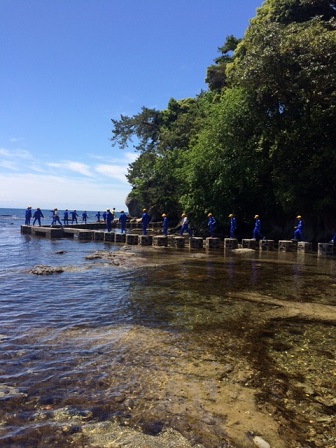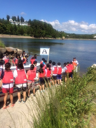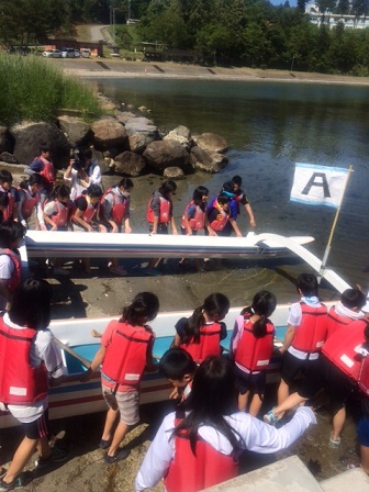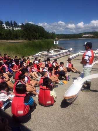 さあ、いよいよ合宿のメイン活動、大型カヌー体験です。この活動こそ、「協力」を実感する活動です。お天気はよかったものの、昨日の午後はカヌー体験が中止になっていましたから、今日は風の強さもちょうどよく、体験できでよかったです。青い空と青い海のもとでの活動でした!