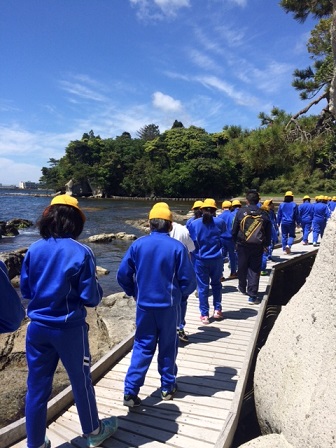 昨日の海洋ふれあいセンターでの様子:人数が多いので2つのグループに分かれ、磯の観察と映像鑑賞のどちらも体験しました。映像鑑賞では、3Dめがねをかけました。また、展示された生き物を手で触ったりもしました。