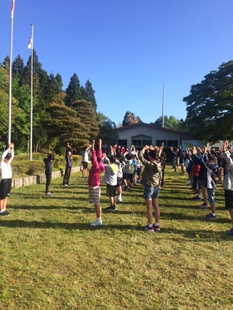 朝のつどいの様子です。津幡町の英田小学校と一緒に行いました。ラジオ体操の後、お互いの学校の紹介を行いました。交流は互いの刺激となりますね。交流後は、自然の家の看板前で記念撮影!それから、きりこ橋までみんなで朝の散歩。そこでは学年全体で記念写真を撮りました。気持ちのよいお天気で、鳥の声も響いていました。さわやかでした!
