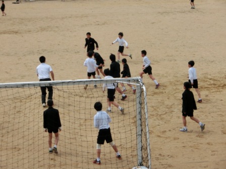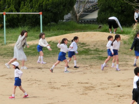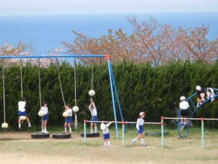 昨日の夕方から夜はひどい土砂降りでしたが、今日も気持ちのよい日になりました。昼休みは多くの子が運動場で遊んでいました。すると・・・先生発見!微笑ましい姿を見ることができました。それにしても、桜のピンクと海の青がバックに見える運動場の眺めは、美しいです。外小自慢の景色ですね。