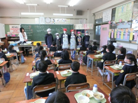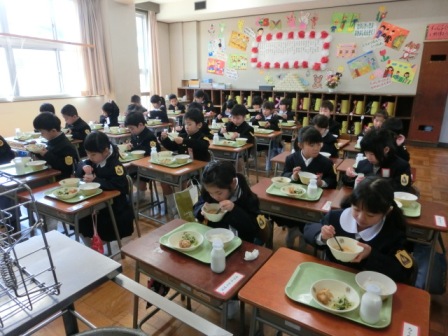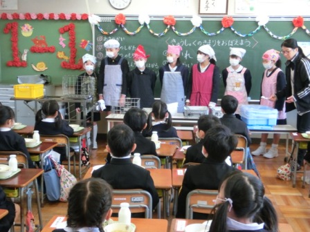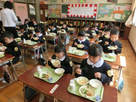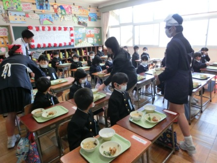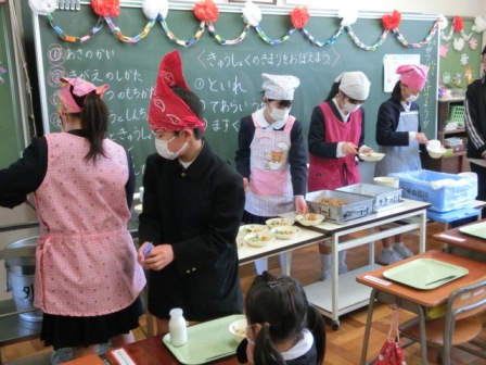 昨日の月曜日から1年生の給食が始まりました。6年生がお手伝いに来て配膳や配りをしてくれています。
