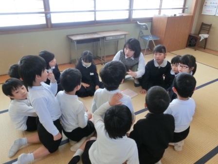 見つけたものを紹介しあっています。写真で確認ですね。タンポポやつくし、いぬのふぐりなどはあったのでしょうか。