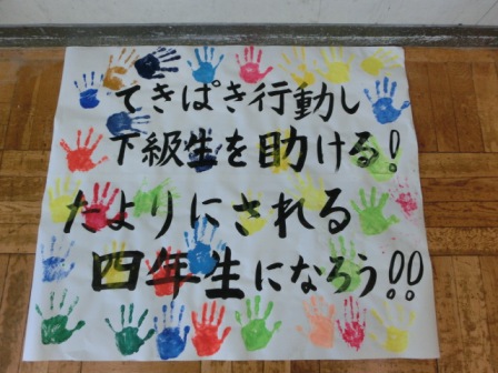 4年生教室には誰もいませんでしたが、作られた目標がありました。学年そろっての目標ですね。「てきぱき行動」・・・素敵です。「下級生を助ける」・・・実は4年生から高学年なんです。これも素敵です。それにやさしい心が表れていますね。