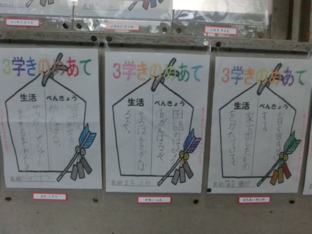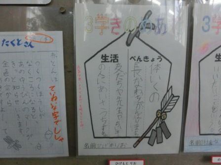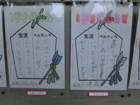 今日。校内を巡っていると、素敵な目標が目に付きました。毎日回っているのですが、子どもたちの様子や書き初めに目が行き、気がついていなかったようです。2年生の目標の一部を紹介します。