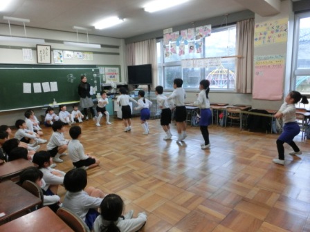 西田先生は「前跳びをするんだけど、その途中で、右とか左とか前と声をかけるから、こんな風にやってね」と言って、お手本を見せて下さいました。そしてみんなでやってみました。