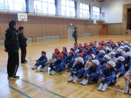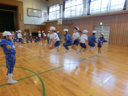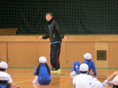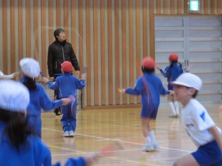 「右」と言われて、体全体が「右」を向いてはダメなのです。腕で回していると、体全体が回ってしまうそうです。手首で回せるようになると、「右」といっても手首は前を向いていて、体が少し右を向けるそうです。つまり、なわとびが上手くなるには、手首で回せるかが大切なポイントとなるようです。実際に見せて下さっての説明は分かりやすく、みんな楽しく頑張っていました。