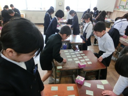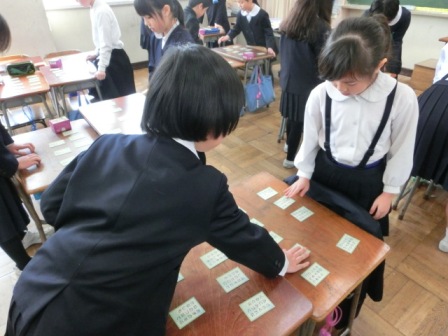 1年生は昨日、たくさんのゲストティーチャーをお招きし、「わくわく昔遊び」としてコマやおはじき、あやとり等を体験していましたが、今日は3年生が五色百人一首(20枚一組)を行っていました。「しーん」となった後、「わぁっ」と歓声が上がって、すごく楽しそうでした。カルタや百人一首も含め、昔から受け継がれている遊びには、長い歴史の中の風習や知恵が盛り込まれていて、子どもの心を惹きつけ、耕してくれるような気がします。