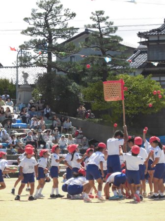 玉入れでは、1つでも多く入れたい!という気持ちで、最後まであきらめず籠を目がけて投げ続けました。どのように投げれば入るのか、考えながら練習しました。