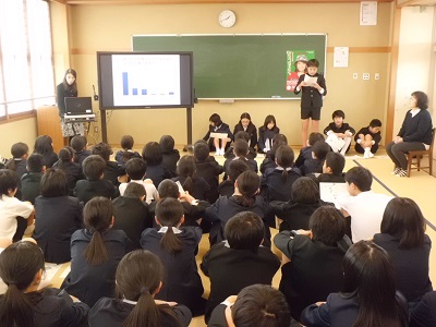 その後、河北台中学の1年生の生徒が学校紹介に来てくれました。中学校と小学校の違いや河北台中が頑張って取り組んでいることを教えてくれました。また、その後には質問タイムが設けられ、子どもたちは気になることを中学生に質問していました。