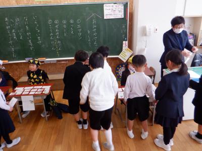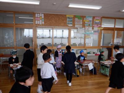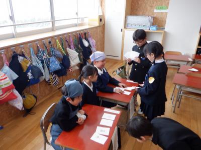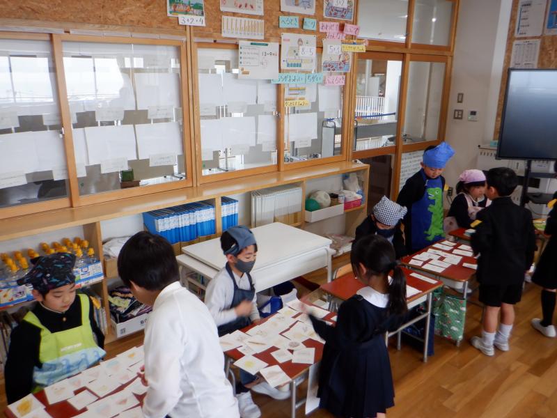 1年2組が「おみせやさんごっこをしよう」という課題で、ものの名前を描いた絵カードを作成し、お店屋さんとお客さんに分かれ活動していました。