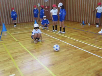 その後、体育館でアイマスクをつけたまま、ブラインドサッカー用のボールでシュートを打つなど、
