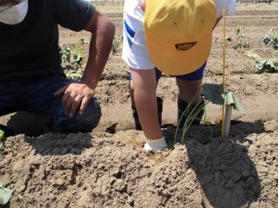 畑の先生に教わりながら、大きなかほっくりが育つようにしっかり植えていました。