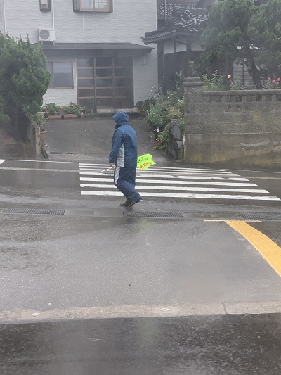 大雨、強風の中、今日も児童のために登校を見守っています。