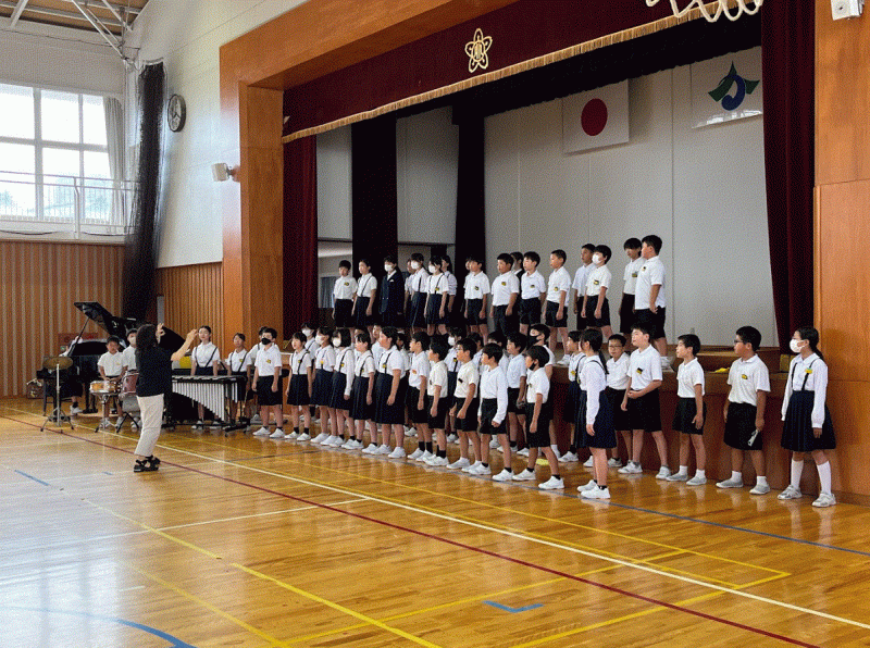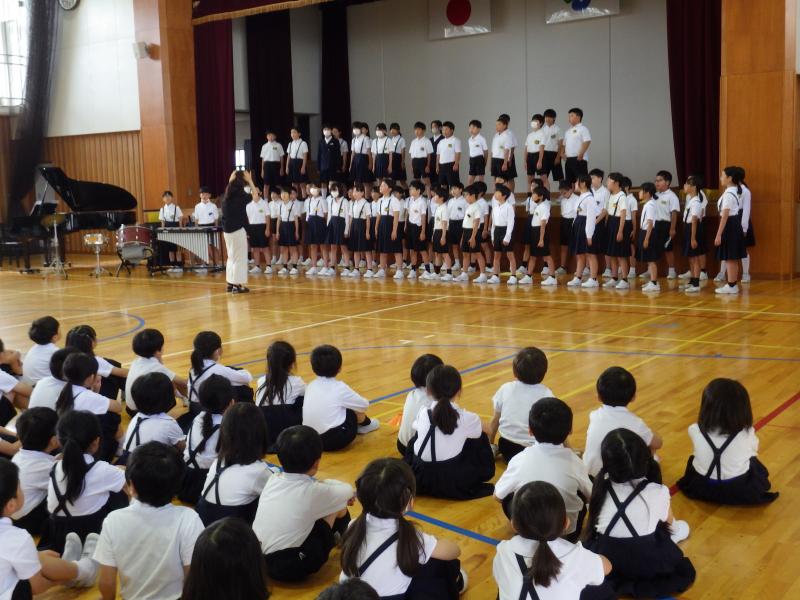 6月10日(月)の朝、全校のみんなに音楽会で発表する歌を聴いてもらいました。週明けの朝一での発表でしたが、びしっと気合いを入れて歌うことができ、たくさんの拍手ももらいました。