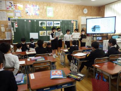 昼休み、多目的教室と図書館で図書ボランティア スマイリーブックさんの読み聞かせがありました。