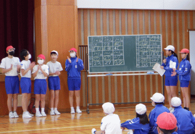 1月30日(火)、6年生にとって小学校生活最後のなわとび記録会が行われました。体育委員が司会進行と運営を行い、1年生と一緒に良い記録を目指し頑張りました。8の字跳びを行うので、1年生が跳びやすいよう、6年生はなわを回す役を担いました。6年生はどちらのクラスも練習以上の結果を残すことができ、1年生のみんなも新記録を出すなど頑張りました。
