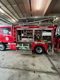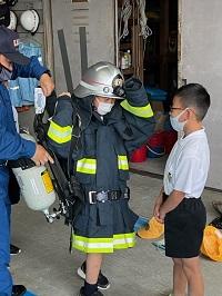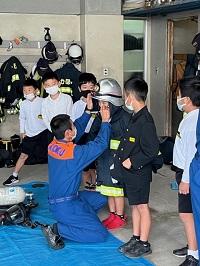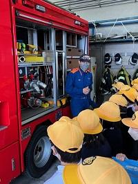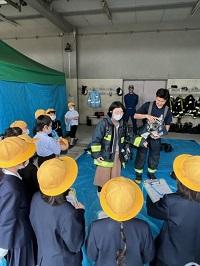 その後、消防署の方が消防活動をするときに、身に付ける服やヘルメット、空気のボンベを担いたりする体験や消防自動車の仕組みや秘密をたくさん教えていただきました。
