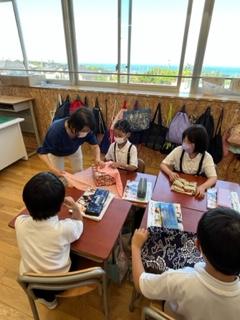 生活支援のボランティアの方に、風呂敷で丸いもの、長いものなど包んでもらいました。