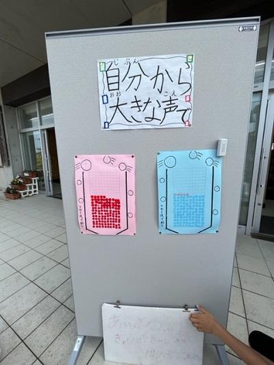 「大きな声であいさつ」をしようというねらいで、赤と白組に分かれて競い合っています。