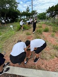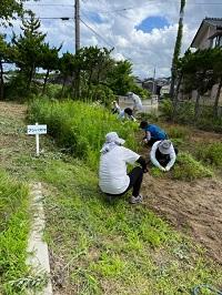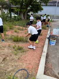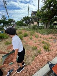 地域からも、10人以上のボランティアの方が毎日来てくださり、草取りの後に瓦チップをまきました。