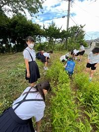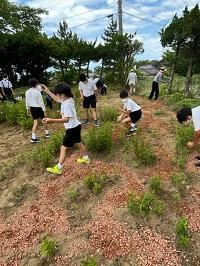 1年生が生活の時間に、アサガオと葉っぱを丁寧に摘んでいました。