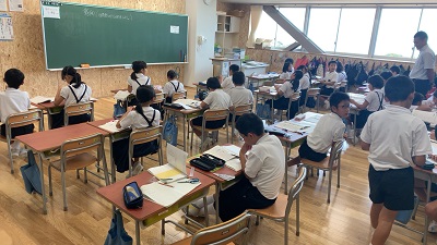 田丸先生をお招きして、毛筆書写コンクールに向けて「雲」の書き方を教えてもらいました。教えてもらったことを意識しながらいつもよりも丁寧に書く姿が見られました。