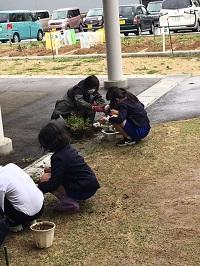 毎日の登下校でお世話ができるようにと、児童玄関前に並べました。