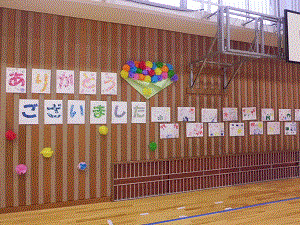 また、体育館の壁を飾り付けして、ありがとうのメッセージが伝わるように準備もしました。図工の時間に作った紙版画や、実行委員が作った花の飾りを使って彩りましたね。