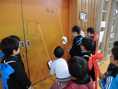 2年生は、グループでおもちゃを作り、どうすれば楽しく遊ぶことができるのかを考え、おもちゃを改良して、うごくおもちゃを完成させました。そして、年長さんにニコニコ楽しんでもらえるような会にしようと目標を立てて取り組みました。