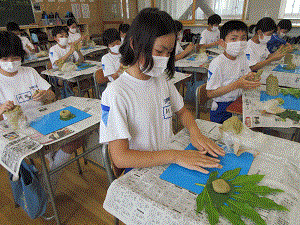 6月17日、かほく市スポーツ文化課よりゲストティーチャーを招き、歴史体験教室を開催しました。ガイダンスでは、縄文時代や弥生時代の生活の様子や遺跡から見つかったものなどについて、授業で学んだことよりさらに具体的に教えていただきました。実際に見つかった土器や黒曜石を近くで見たり触ったりすることもできました。体験では弥生土器づくりを行いました。粘土を葉の上に乗せ、当時の様子を想像しながらそれぞれ個性が見られる土器を形成することができました。10月には今回作った土器を焼くので、それまでは学校で乾燥させておきます。丈夫な土器に仕上がるといいですね。