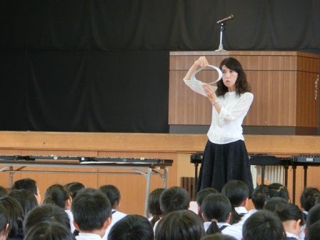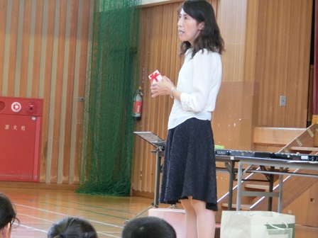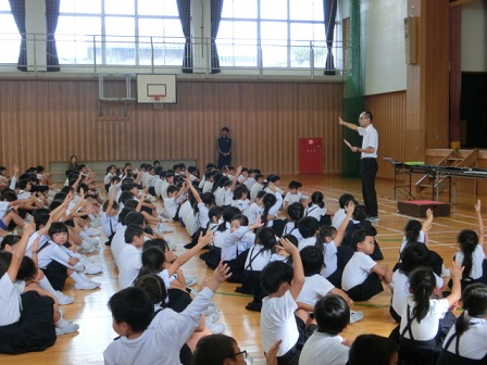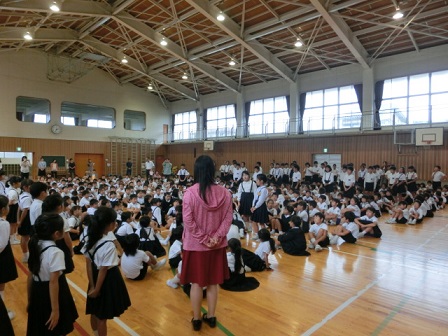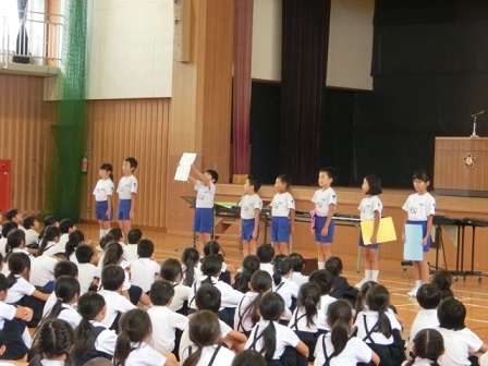 9月29日(金)に10月に向けての全校集会が行われました。内容は表彰伝達・校長先生のお話、生活についてのお話、体に関するお話、1年生の音読発表、今月の歌でした。