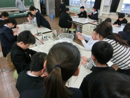 【科学実験クラブ】針金でアメンボを作って水に浮かべようとしていました。これのバランスが難しく、なかなか浮かばない。全員分浮かんだチームからは思わず歓声と拍手が!